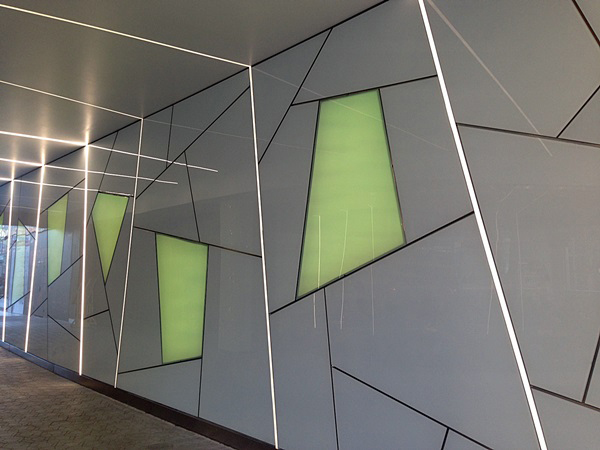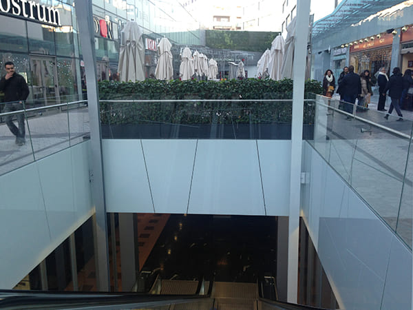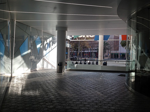 Marquesina d'acer amb coberta de vidres amb geometria irregular i perfils d'alumini, baranes i faldons de vidre serigrafiat a l'àcid, revestiment mural de vidre trempat blanc extraclar i panell de llum amb juntes inox.