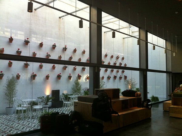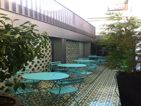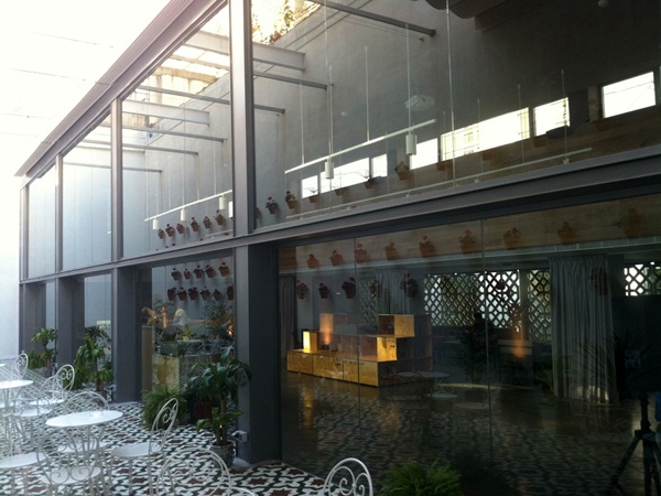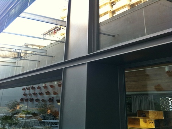 Tancaments amb vidre laminar del pati amb bigues d'acer lacat.