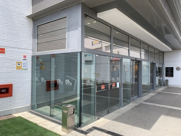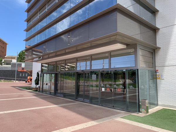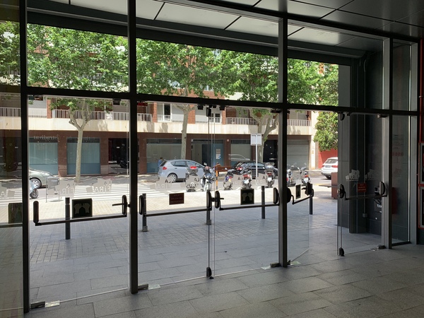 Tancaments de vidre tipus mur cortina en planta baixa per accessos al centre, amb portes de vidre securitzat integrades.