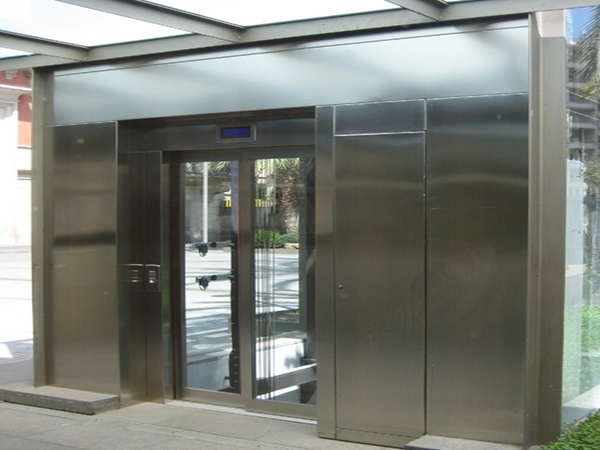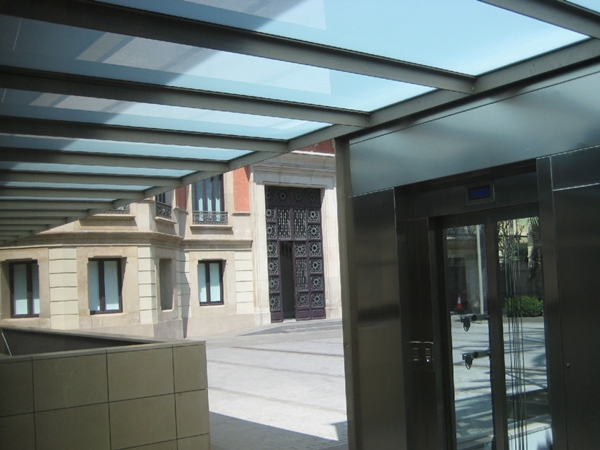 Edicle d'ascensor d'acer inoxidable setinat i vidre, així com marquesina superior atirantada a façana amb costelles de perfil T i envidriament laminar òpal.