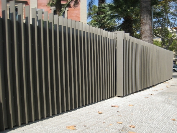 Tanca perimetral d'acer conformada per platines de cantell i fons de xapa interior, integrant una porta corredissa motoritzada del mateix disseny.