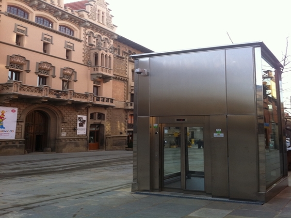 Edicle d'ascensor d'acer inoxidable AISI316 amb envidriament laminar, incloent estructura d'acer interior de suport dels mecanismes.