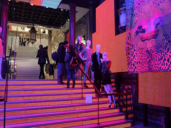 Reforma d'escala metàl·lica mitjançant graons amb plataformes d'alumini antilliscant, alçades de vidre laminat i calaixos d'il·luminació LED