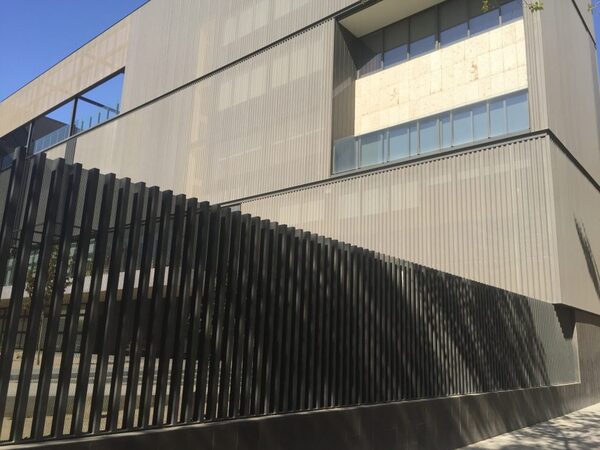 Façanes i tancaments en planta baixa de safates d'acer termolacat, portes, reixes, baranes de vidre, pèrgoles i serralleria interior.