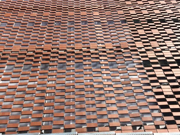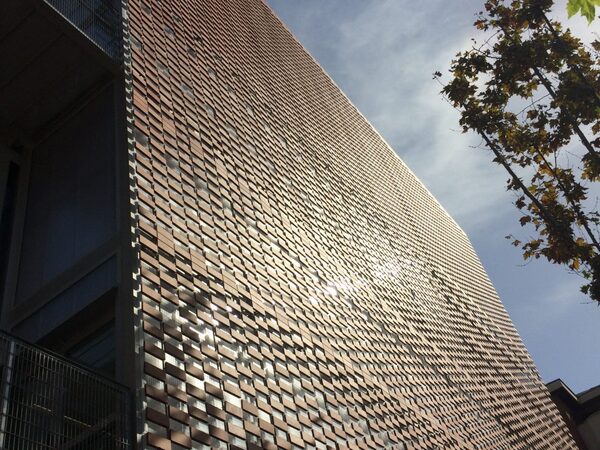 Instal·lació de façana amb sistema Flex-Brick, amb malla d'acer inoxidable i peces ceràmiques integrades.
