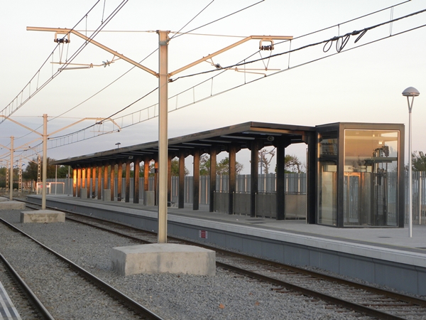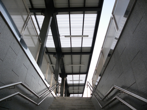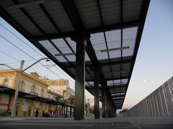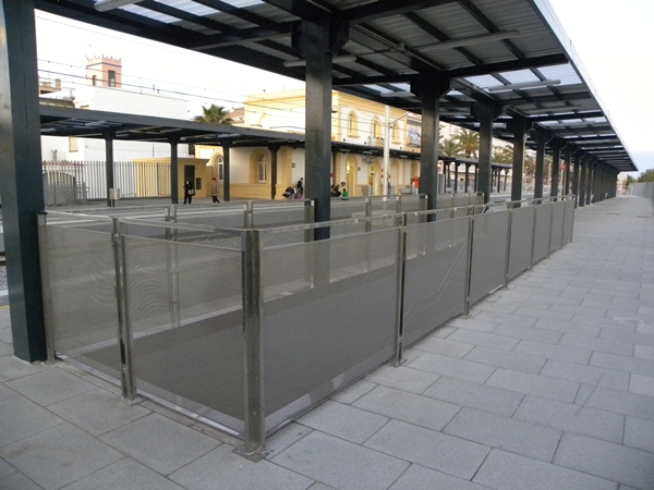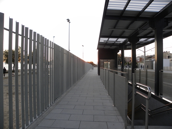 Marquesines d'acer S275JR amb coberta de xapa trapezoidal lacada i lluernaris de policarbonat corrugat. Tanca tipus ADIF de perfils angulars 80x60x7 galvanitzats en calent i disposats en diverses orientacions.