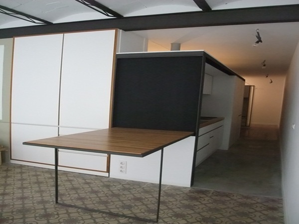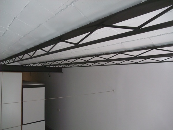 Reforços en gelosia de biguetes metàl·liques existents. Sistema de taula metàl·lica plegable amb sobre de fusta.