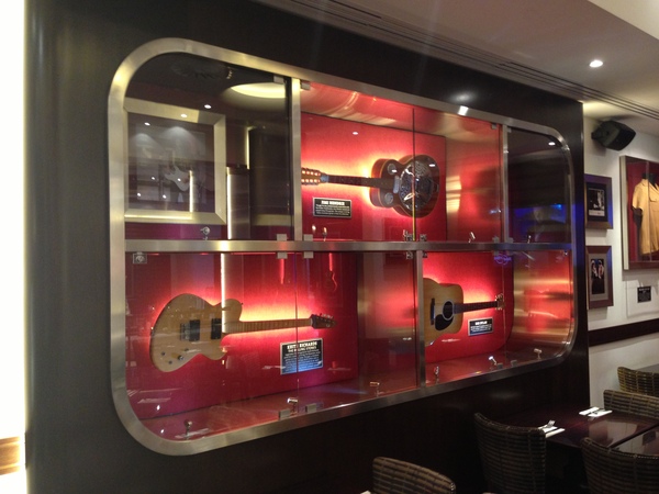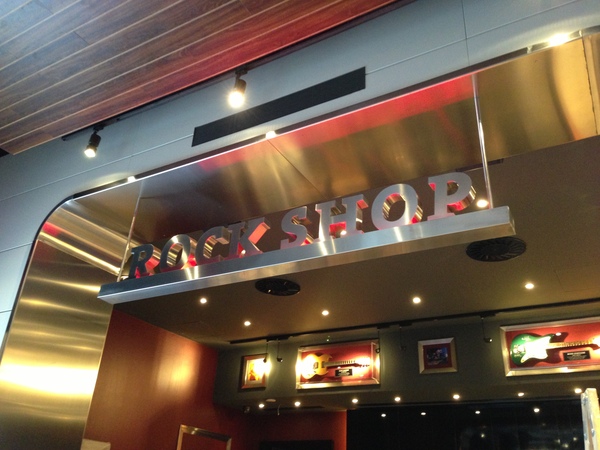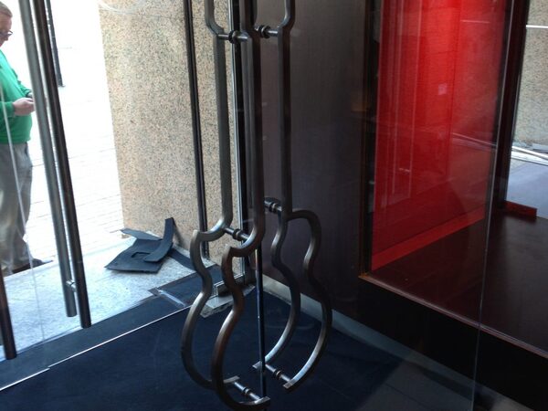 Façana amb fixos de vidre superiors i portes securitzades d'accés, amb tibadors d'acer inoxidable en forma de guitarra. Vitrines i armaris interiors de vidre trempat. Pòrtics d'entrada a la botiga, baranes, revestiments, paraments de metacrilat, etc.