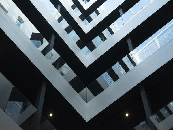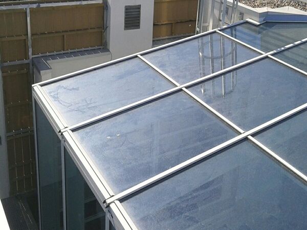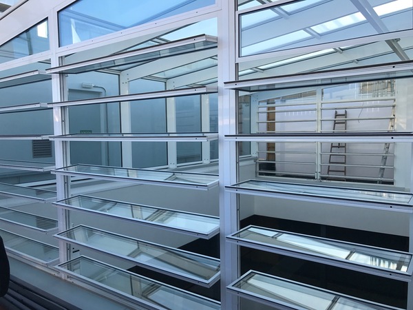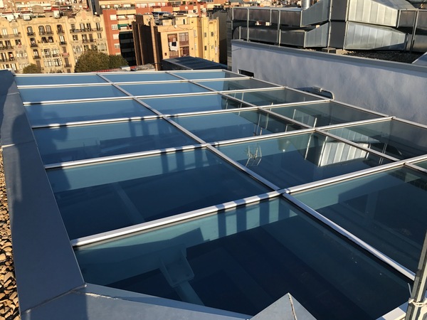 Baranes de vidre volat a tota l'alçada del nucli central de l'edifici. Lluernari d'acer, alumini i vidre a coberta amb integració d'exutoris per alliberació de fums i ventilació.