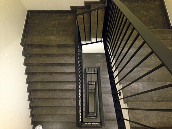 Conjunt de fusteries d'acer i vidre, revestiments de xapa negra d'acer envernissada i baranes d'escala i patis interiors.