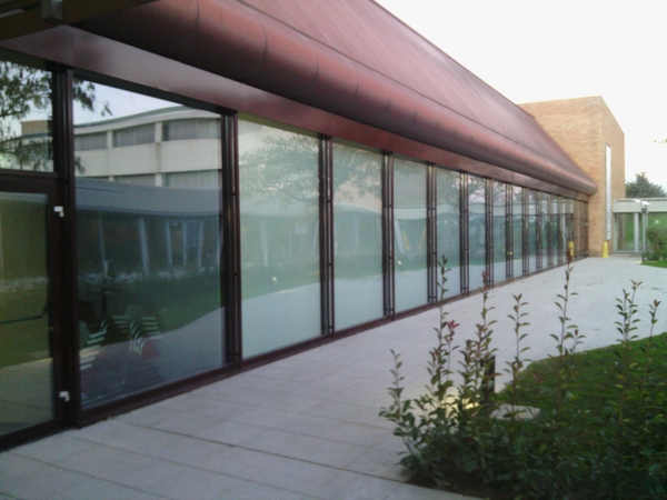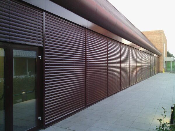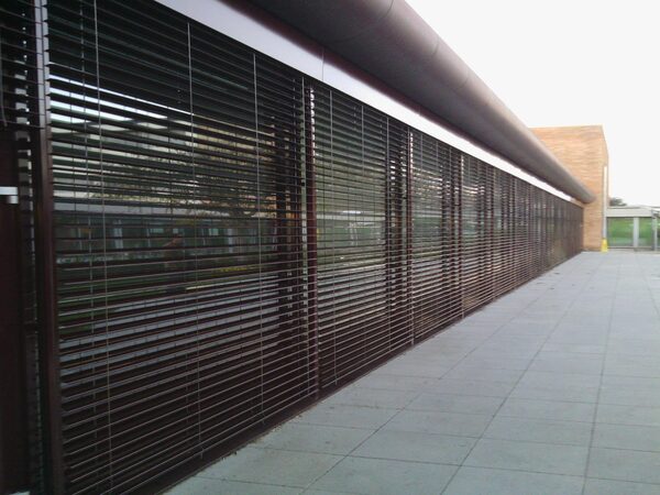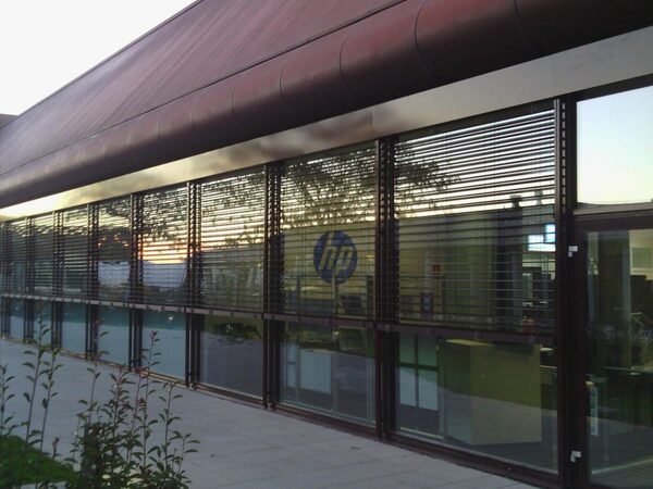 Murs cortina d'alumini i vidre de control solar, amb persianes exteriors apilables i orientables tipus Metalunic i estors interiors. Fusteries d'alumini, revestiments de panell composite, etc.