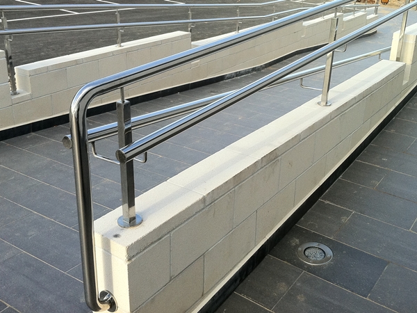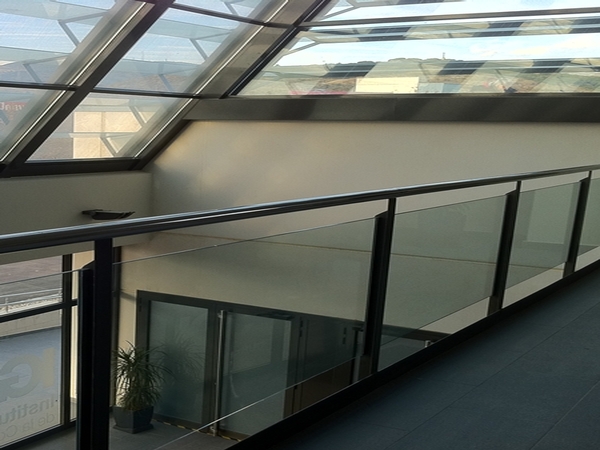 Estructura del mur cortina i les costelles de suport dels vidres en voladís, així com passamans inox en rampes.