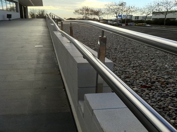 Estructura per a mur cortina inclinat, caballets en zig-zag per a suport de vidres, remats de coronament de coberta, passamans inox per escales i rampes, etc.