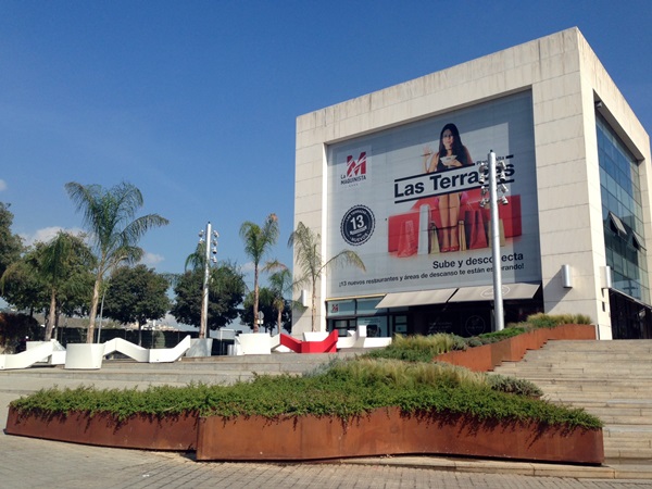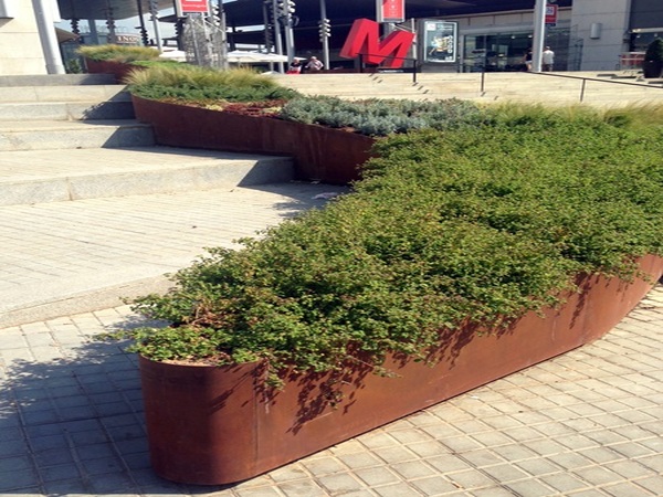 Jardinera de xapa d’acer corten corbada integrada en escales d’accés al centre comercial. A la seva part inferior integra il·luminació LED nocturna. Corten oxidat per envelliment natural.