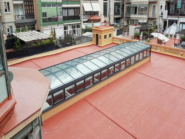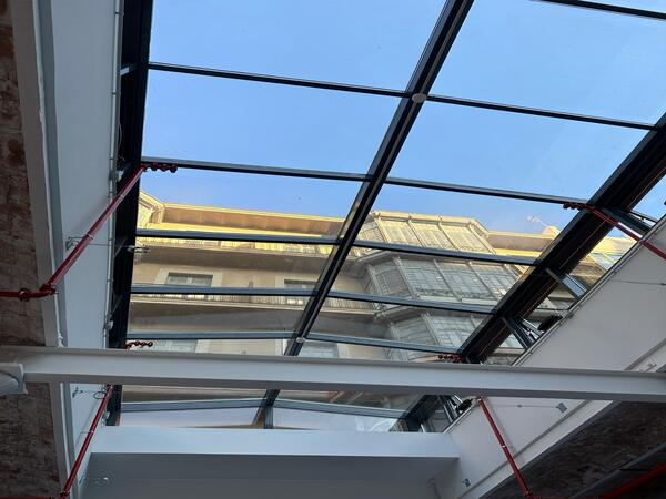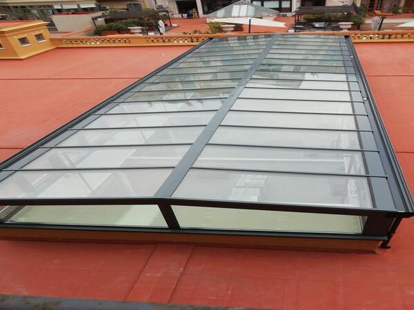 Lluernari a 2 aigües d’alumini i vidre amb tancaments practicables laterals.
