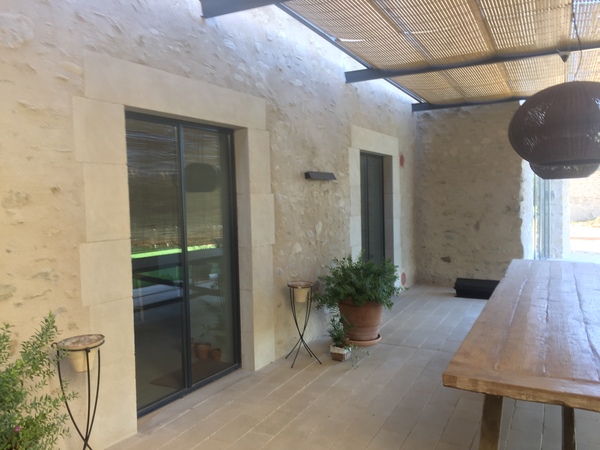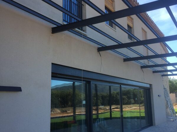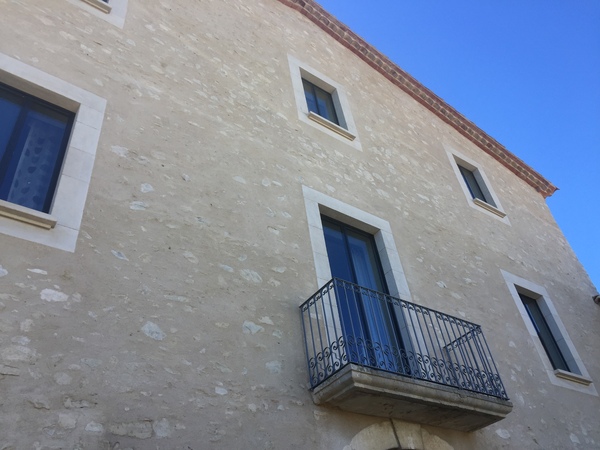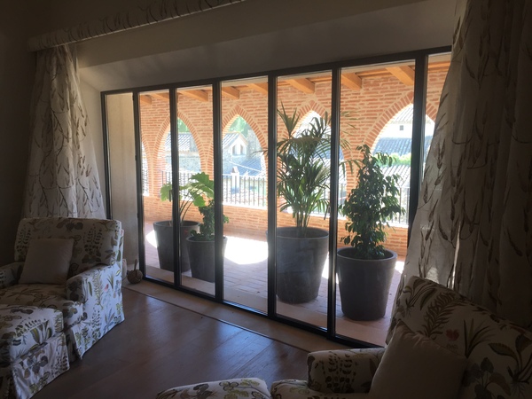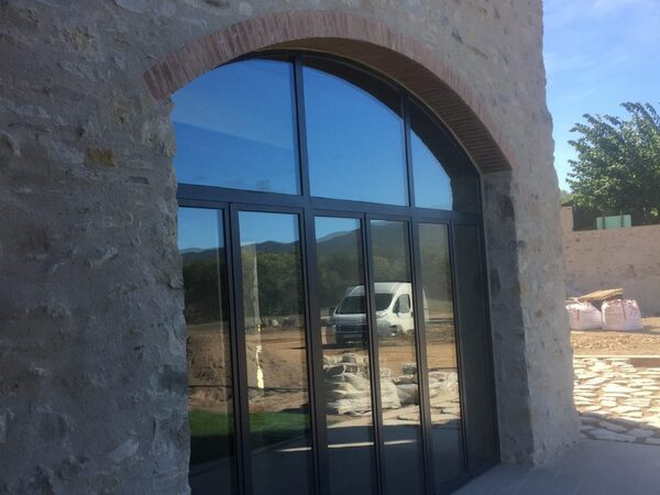 Conjunt de tancaments Jansen Janisol Arte per totes les façanes de la masia, amb perfileria mínima, parts corbades i porticons de fusta integrats. Fusteries tipus Janisol per tancaments batents de gran format i correderes/elevables, i tipus Faltwand per fusteries replegables. Envidraments amb vidre aïllant i baix emissiu.