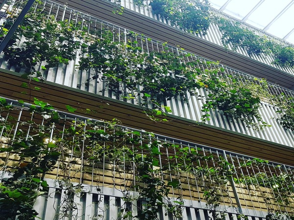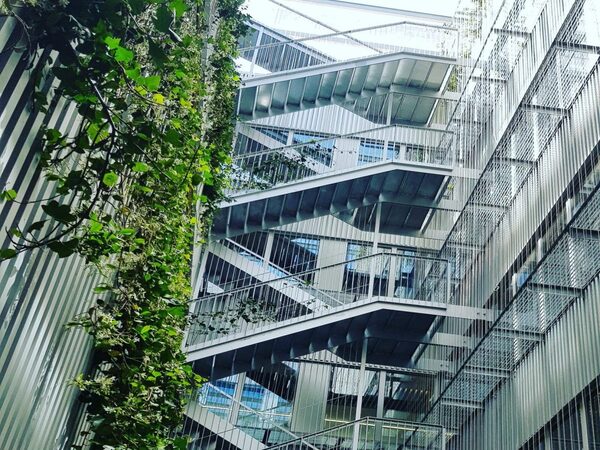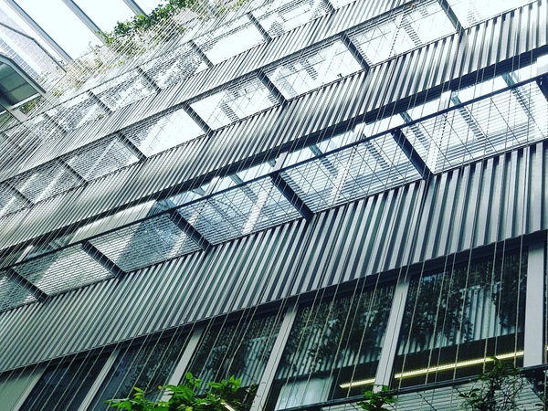 Façana de perfil grecat d'alumini de disseny propi, passeres de manteniment amb relliga galvanitzada, baranes i façana vegetal amb cablejat inox i cordes.