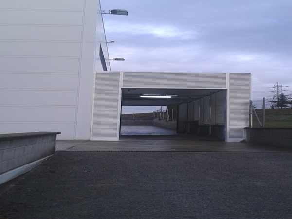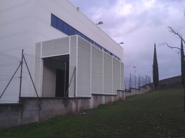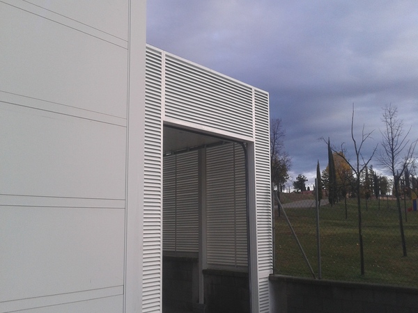 Garita d'accés per vehicles policials annex a l'edifici principal, construïda amb estructura metàl·lica, reixes de lames tipus Z, coberta de panell sandwich i portes seccionals automàtiques.