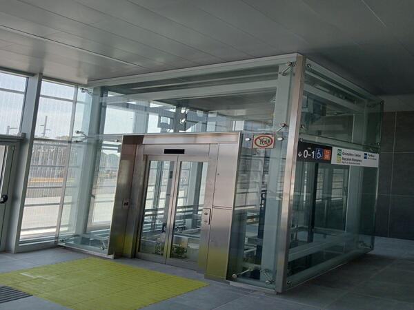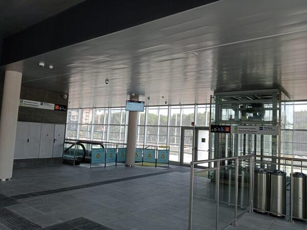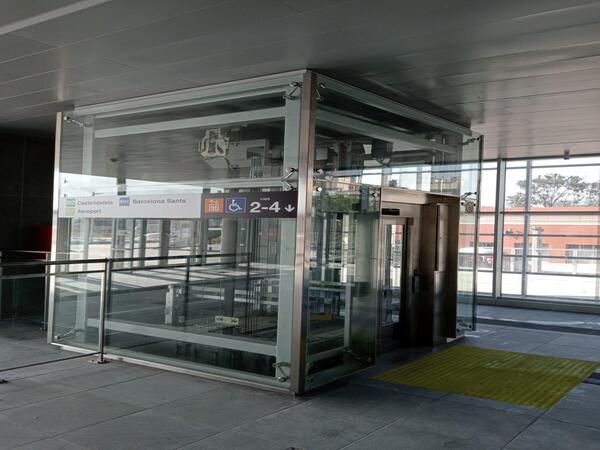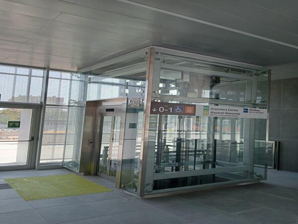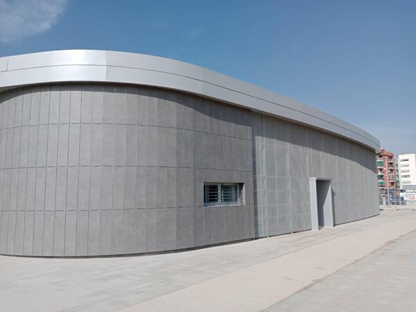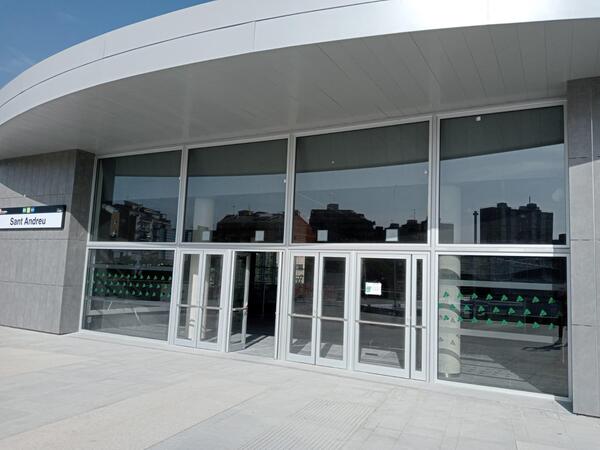 Façana de xapa miniona perforada lacada, tancaments dels accesos d’alumini i vidre, i edicles d’ascensors de vidre i acer inoxidable.