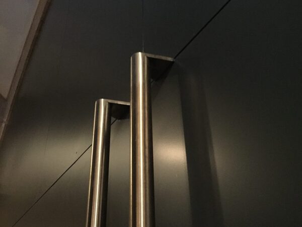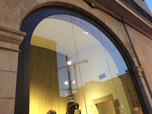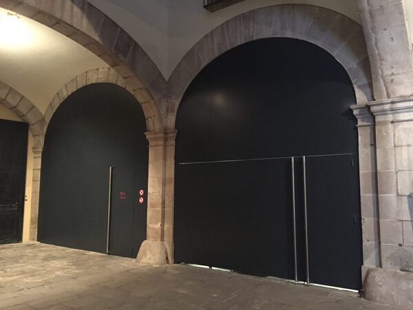 Tancament pivotant de grans dimensions amb eix central, conformat per perfileria d'acer i envidriament laminat de control solar. Tancaments interiors de xapa d'acer resseguint la geometria irregular de les arcades, amb tiradors d'acer inoxidable.