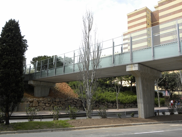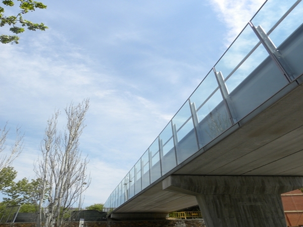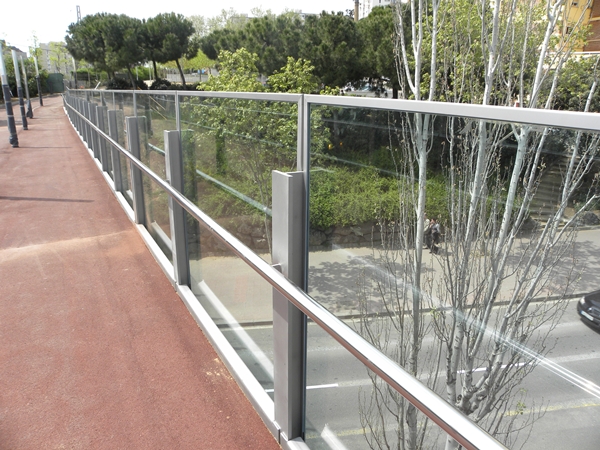 Aplacat lateral amb xapa inox AISI316 ranurada a làser i sorrejada amb microesfera de vidre, així com muntants del mateix material i envidriament laminar transparent.
