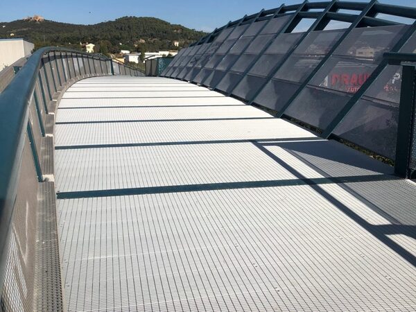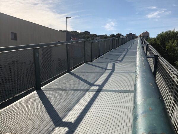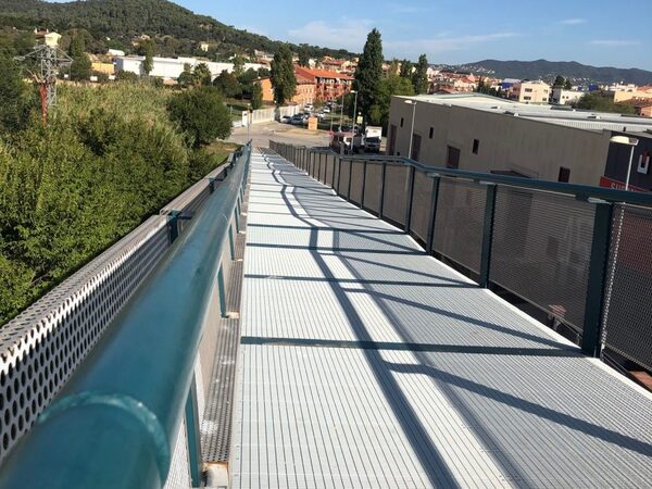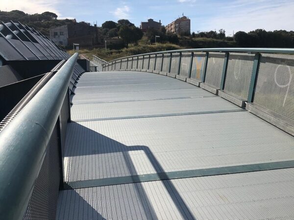Nou paviment d'alumini anoditzat amb perfil dissenyat i extrusionat a mida pel projecte, amb fressats transversals per augmentar resistència al lliscament i per evaquació d'aigües.