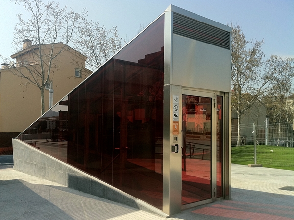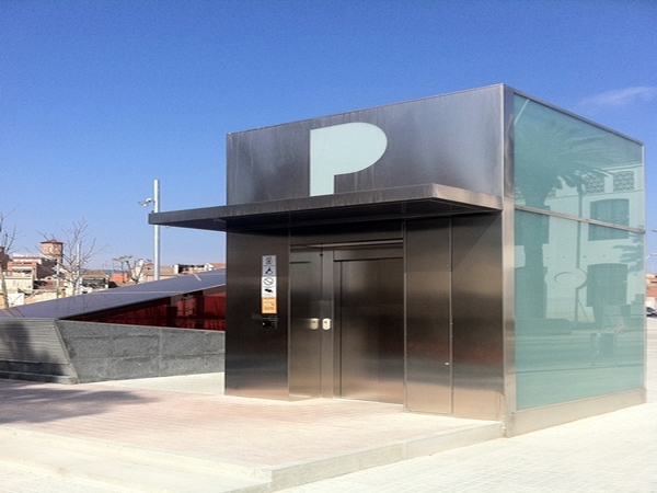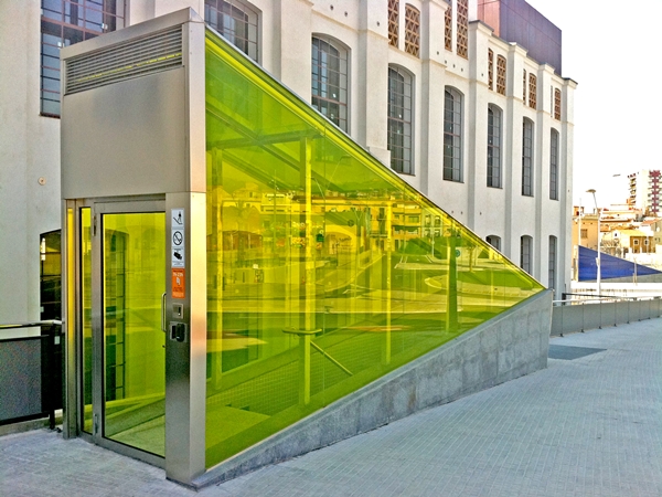 Edicle de sortida de l'aparcament construït mitjançant estructura galvanitzada, subestructura inox i vidre laminar color vermell. Porta inox tipus Forster Presto.