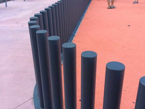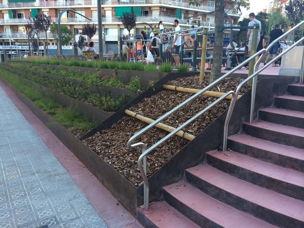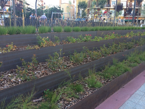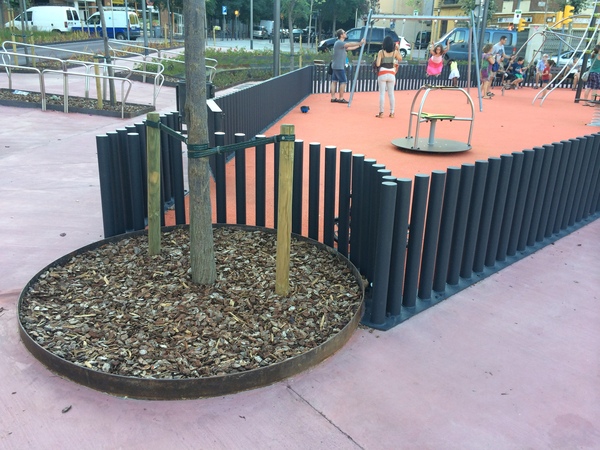 Fabricació i muntatge de jardineres, envans, vorades, escocells i escales d'acer corten. Tanques de jocs infantils tipus Ronda amb trams rectes i corbats.