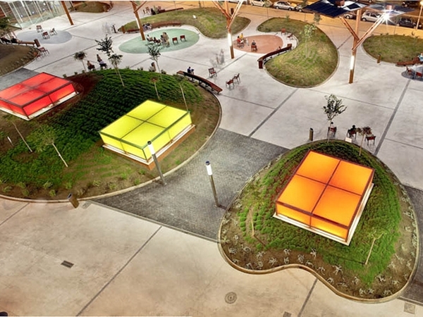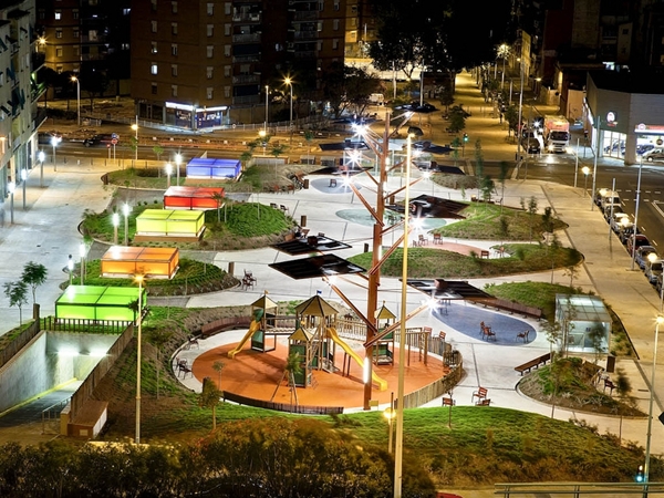 Encintats corbats d'acer galvanitzat per a terraplenats. Pèrgoles fotovoltaiques amb braços atirantats i superfície inferior reflectant per a il·luminació.