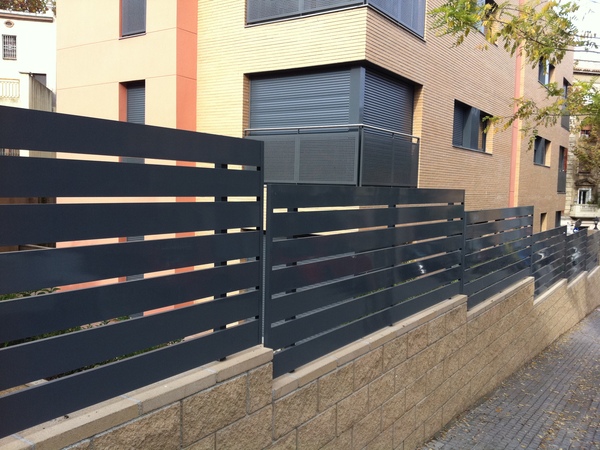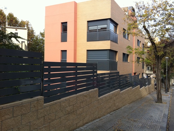 Fusteries d'alumini i vidre, folrats de xapa lacada i tanca exterior de lames d'alumini lacat amb integració de portes d'accés. Serralleria interior, baranes de xapa perforada d'acer i passamans inox en balcons, etc.