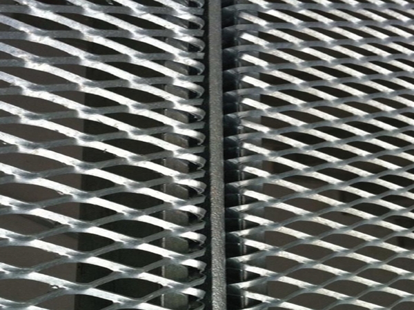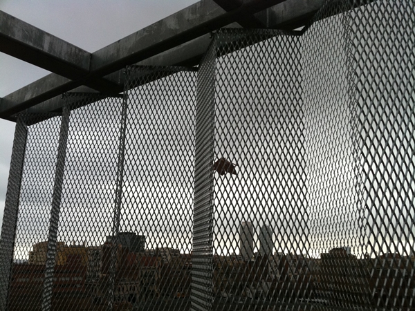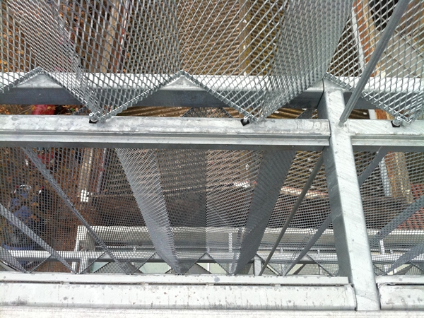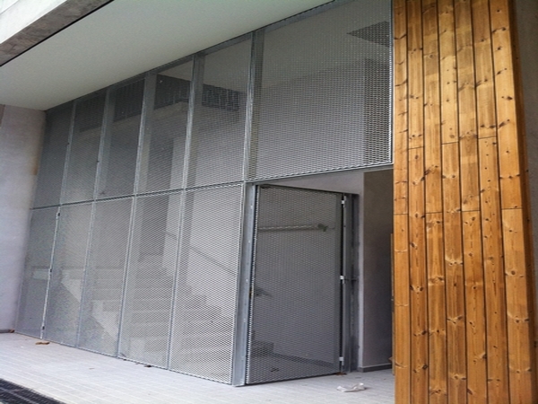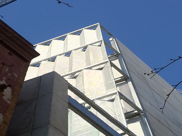 Estructura galvanitzada i doble pell de façana conformada mitjançant metall expandit tipus deployè en disposició de rombe vertical i plegat en forma d’acordió, tot galvanitzat en calent.
