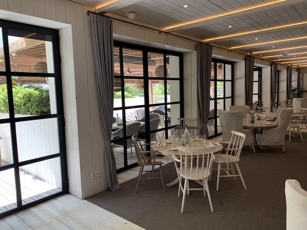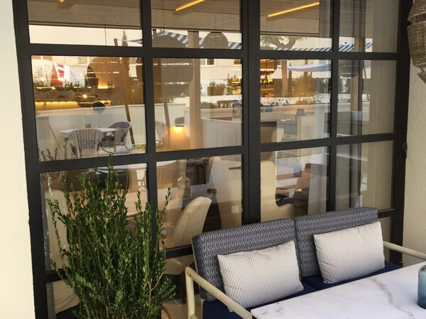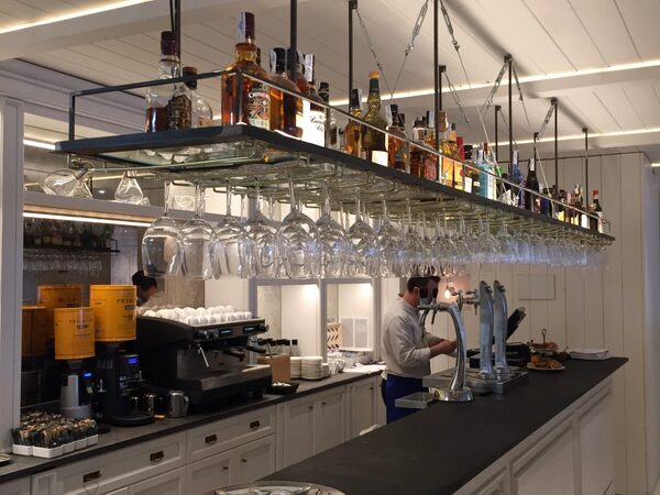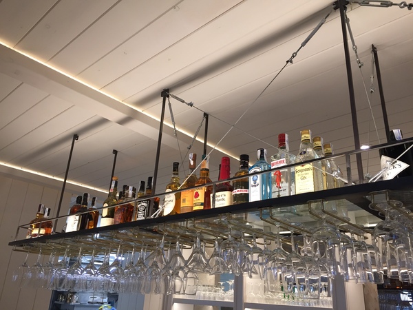 Fusteries fixes i batents de façana amb perfileria d’acer i vidre formant retícula. Botellers penjats del sostre d’acer negre, cables tensors galvanitzats i reposacopes inox.