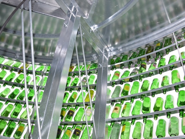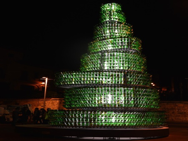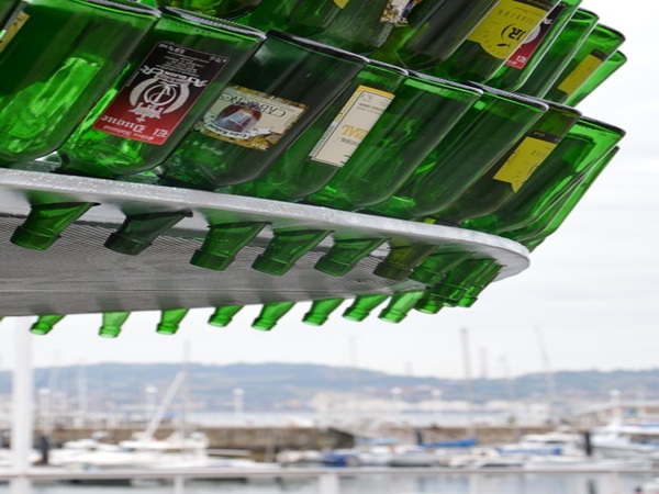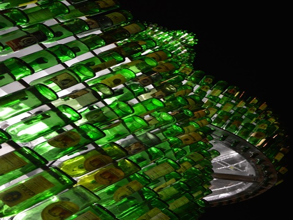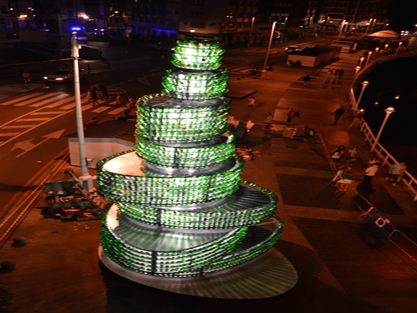 Arbre de la Sidra realitzat per EMULSA a Gijón, fabricat amb estructura tubular galvanitzada desmuntable i aprox. 3000 ampolles reciclades de sidra.