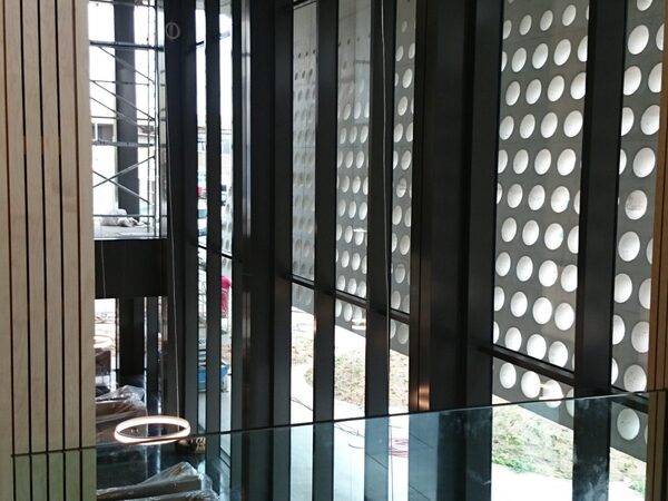 Façanes de mur cortina estructural i tota la fusteria d'alumini tipus Reynaers del tanatori. Revestiments de composite, llindes i brancals, remateria, etc. Envidriaments en façana i interiors, mampares, vitrines, portes securitzades, baranes, etc.